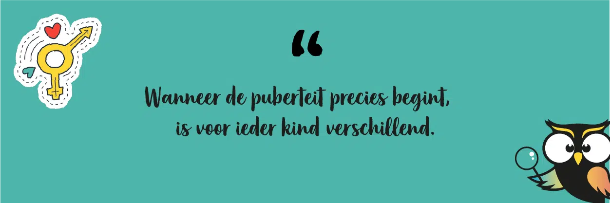 Wanneer de puberteit precies begint, is voor ieder kind verschillend. Bij sommige kinderen gieren de hormonen al op de basisschool door hun lijf. Andere kinderen merken die veranderingen pas als ze op de middelbare school zitten. Jongens puberen over het algemeen wat later dan meisjes.