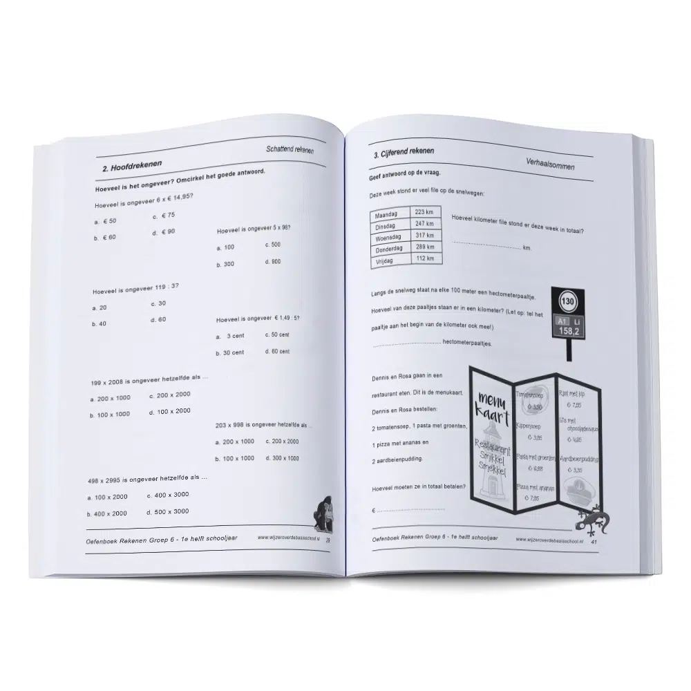 Het Oefenboek Rekenen Groep 6 – 1e helft schooljaar is ingedeeld per somsoort. In elk hoofdstuk oefen je eerst met kale sommen en vervolgens met verhaaltjessommen.