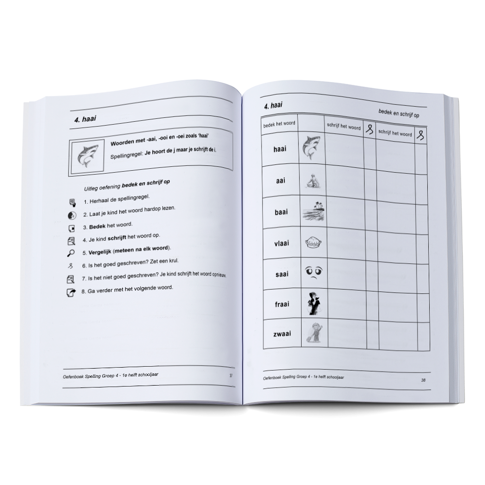 • Voorkomen dat je kind achterblijft met spelling in groep 4. Met de werkbladen in het oefenboek kun je goed in de gaten houden of alle spellingcategorieën voldoende zijn ingeoefend.