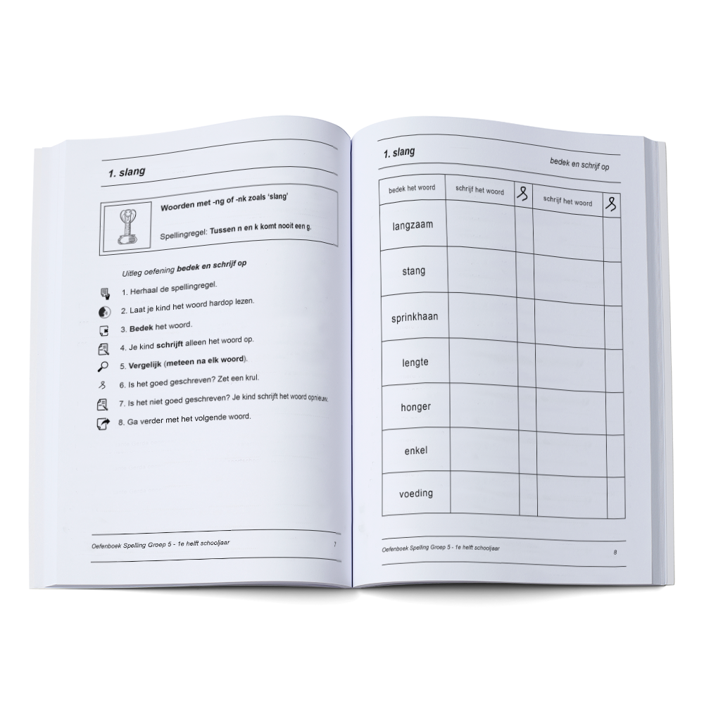 Waarschijnlijk wil je je kind straks met zelfvertrouwen de Cito-toets Spelling M5 (midden groep 5) in januari laten maken. In het Oefenboek Spelling Groep 5 – 1e helft schooljaar komen alle spellingcategorieën aan bod die ook in de Cito-toets M5 voorkomen. Je kind oefent deze woorden met twee verschillende oefeningen.