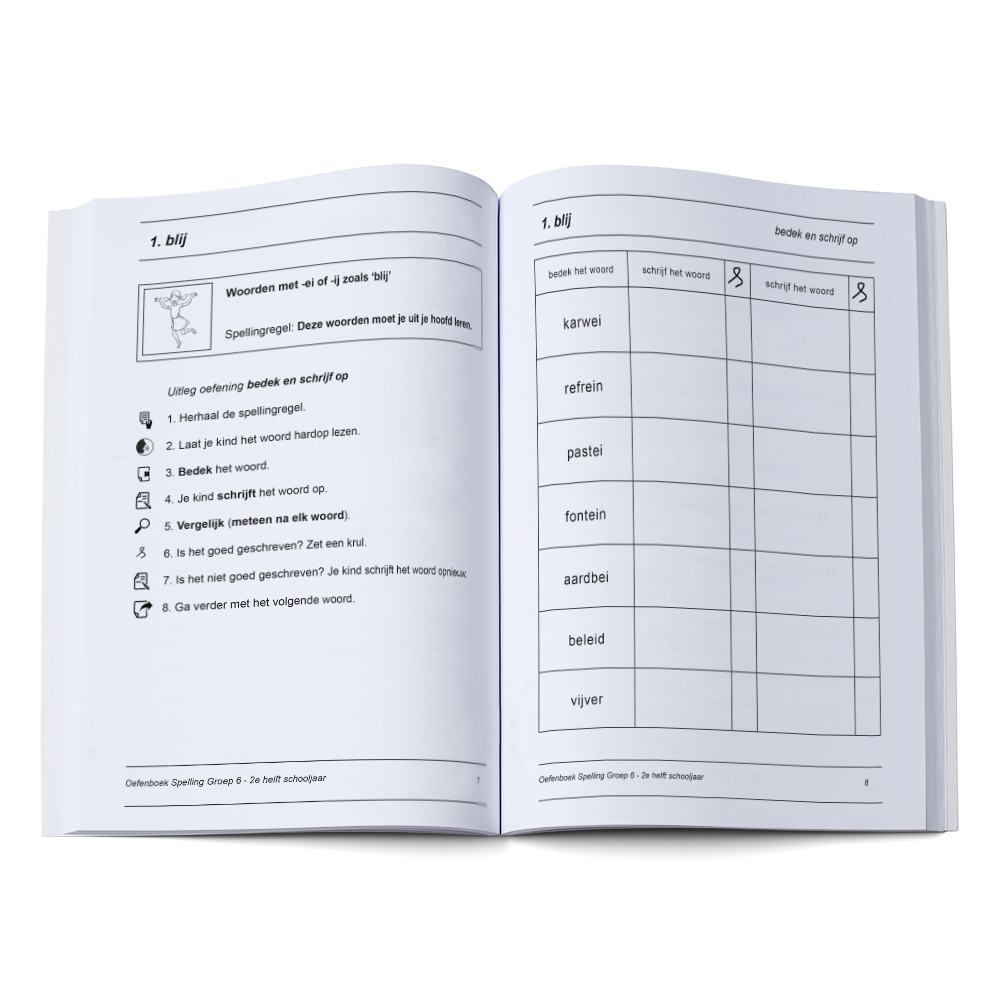 Alle spellingcategorieën voor eind groep 6 met de bijbehorende spellingregels vind je terug in het oefenboek.