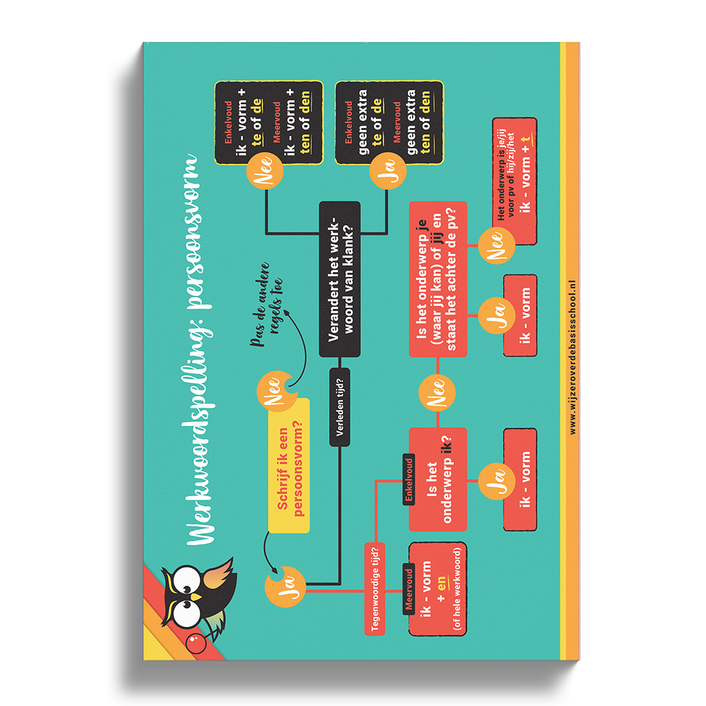Handig schema werkwoordspelling (persoonsvorm) op een A4-formaat poster. Handig bij het oefenen van werkwoordspelling!