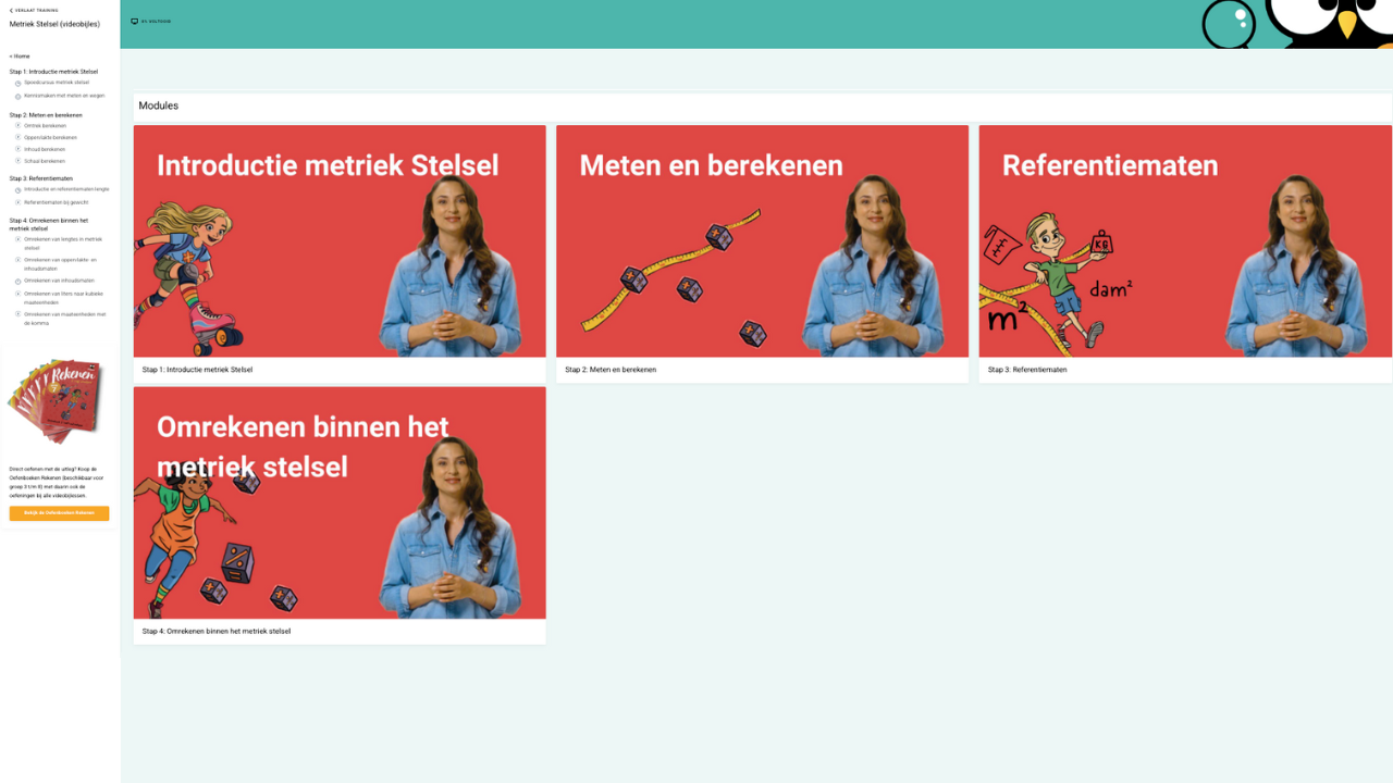 Videobijles Rekenen Groep 7 bestaat in totaal uit 62 lessen, verdeeld over de volgende modules: