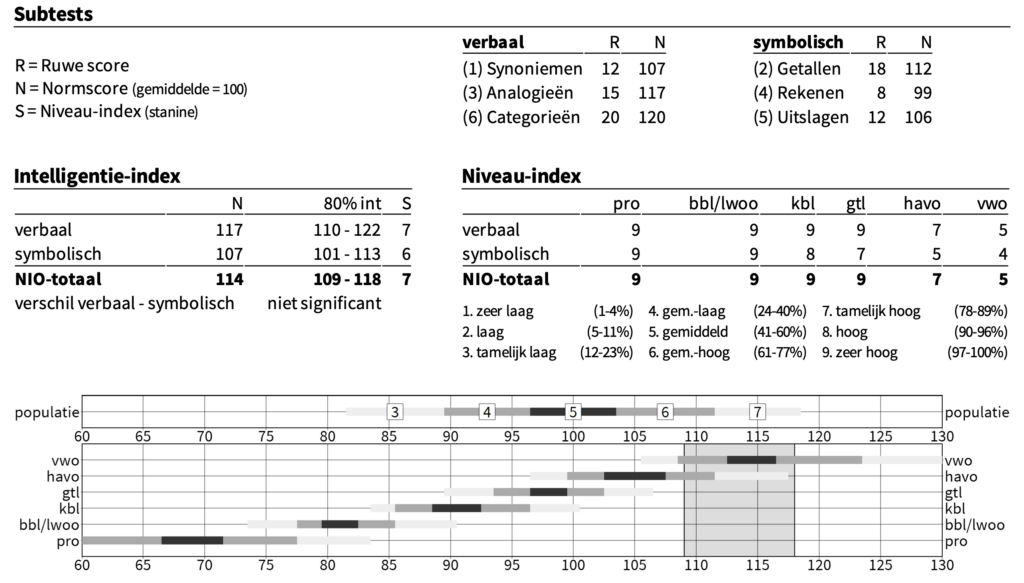 Vervolgens zie je de intelligentie-index. Daarin komt naar voren wat de NIO-totaalscore is.