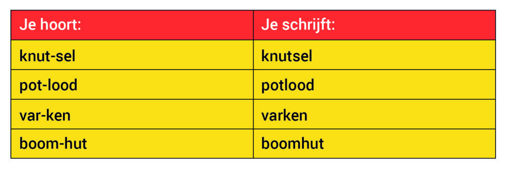 - Wanneer je aan het einde van een klankgroep een korte klank hoort, dan schrijf je daarna twee medeklinkers op. In de meeste gevallen gaat het om twee dezelfde letters. Dit zie je bijvoorbeeld bij het woord ‘letters’ (klankgroepen: le-tters). Dit hoeft echter niet altijd het geval te zijn. Het kan namelijk ook zo zijn dat je na de klinker de letters ‘n’ en ‘g’ achter elkaar ziet staan. Ook wanneer je ‘ch’ schrijft, maar een ‘g’ hoort, staan er dus al twee medeklinkers en hoeft er dus niets te worden verdubbeld.