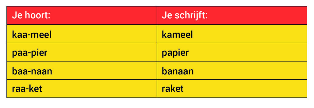 Waar je ook op moet letten, zijn de drietekenklanken aai, ooi en oei, en ook op de restklanken ‘eeuw’ en ‘uw’. Je hoort hier bij het verdelen in klankgroepen steeds wel een lange klank, maar de lange klinkerregel geldt hier niet! De klanken worden hier namelijk als vaste woordstukjes gezien en die stukjes worden in de regel altijd op dezelfde manier geschreven.