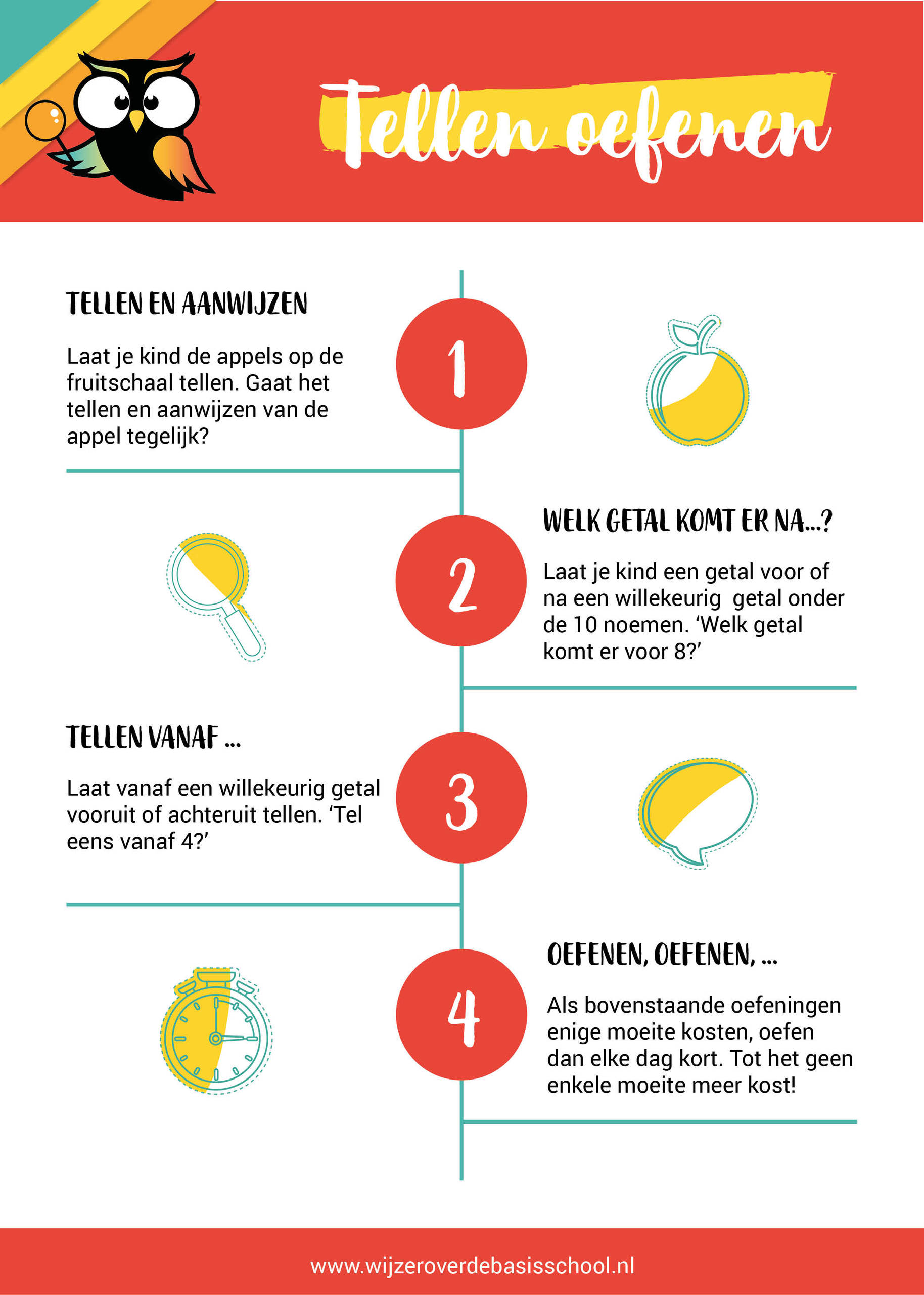Onderstaande oefeningen kun je doen om te controleren of je kind goed kan tellen. En om deze vaardigheid, waar nodig, te verbeteren. Als je kind in groep 3 echt moeite heeft met deze oefeningen, dan is het ook aan te raden om dit met de leerkracht te bespreken.