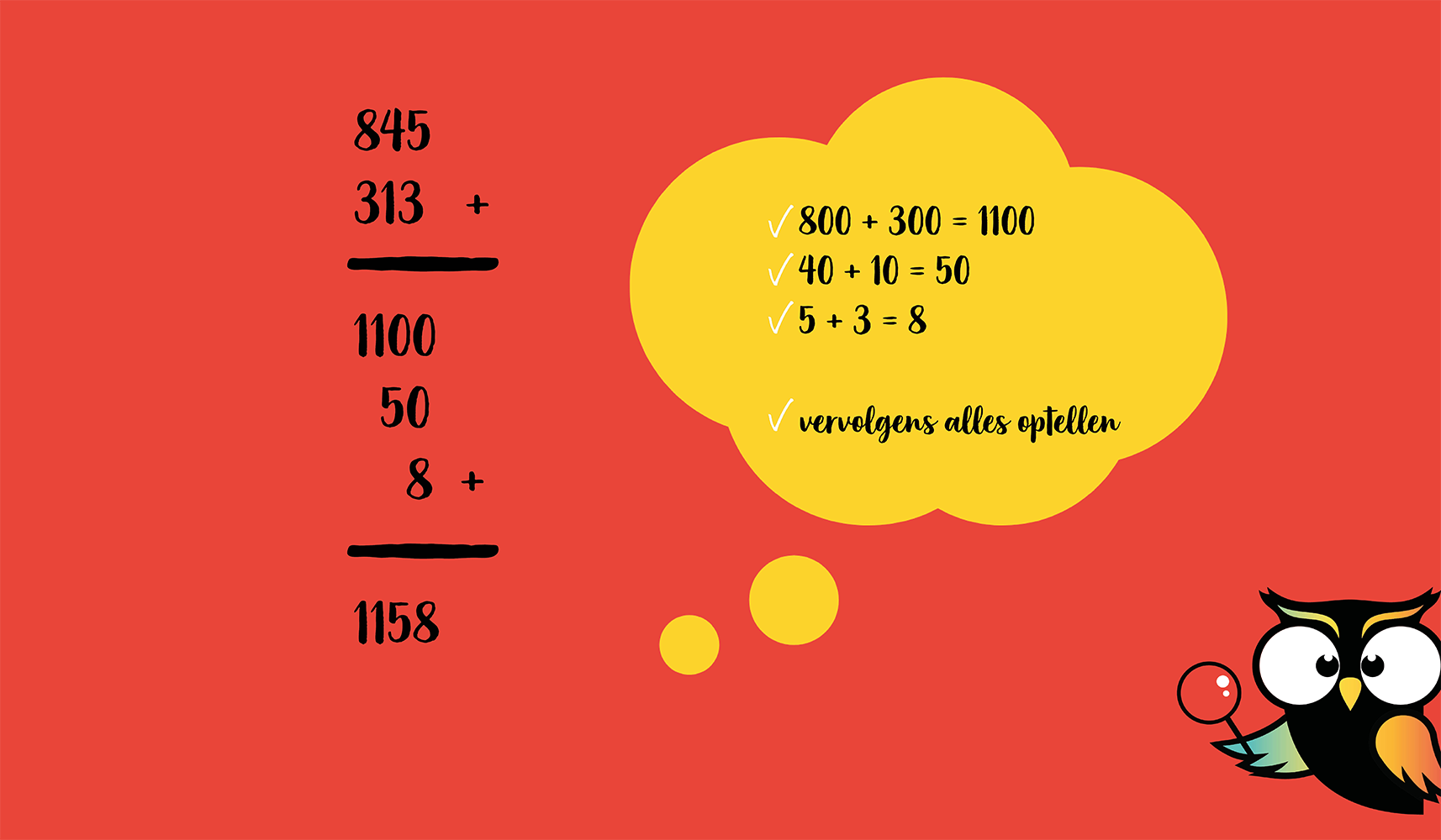 Bij een optelsom tel je eerst alle honderdtallen bij elkaar op, dan alle tientallen en tot slot alle eenheden. Bijvoorbeeld: